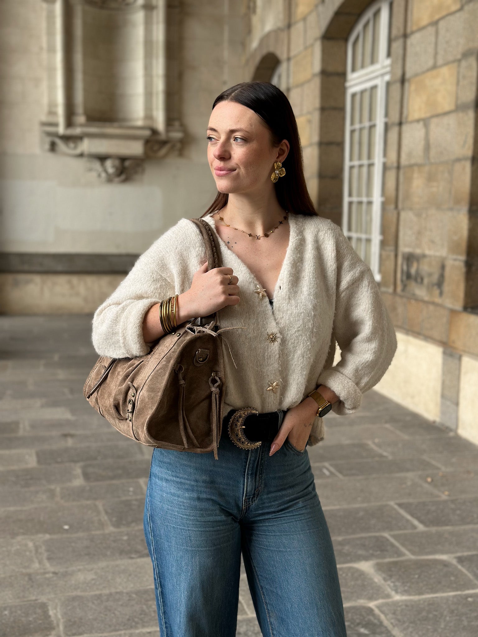 Alliez élégance, confort et allure urbaine avec le sac à main Kate large en suède. Sa silhouette généreuse et souple, ses détails métalliques signature et son esprit city-chic en font l’accessoire parfait pour celles qui souhaitent allier style, caractère et sophistication quotidienne.